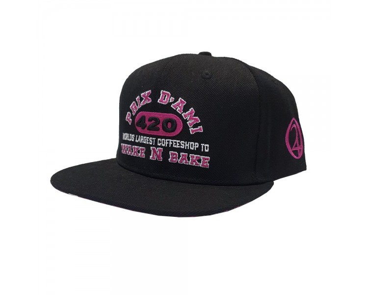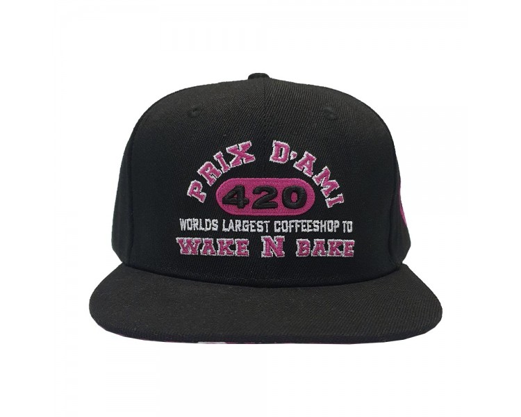 Front Logo: Purple Pink wake & Bake Prix D’ami logo with white outline 3D embroidery
